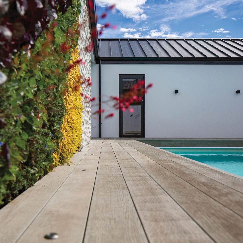 Nous privilégions des matériaux renouvelables tels que les bois locaux, les lames de résine minérale Millboard , le bambou, le grès cérame certifié, et la pierre naturelle locale. Ces matériaux s’intègrent harmonieusement dans le paysage, tandis que les pavés perméables favorisent la gestion des eaux pluviales.